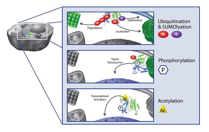 盡管目前已知的PTM的種類超過400種,但只有少數幾個被詳細研究過,主要包括甲基化、磷酸化、乙?;⒎核鼗?/span>SUMO化,它們被證明是幾乎所有細胞的關鍵調節(jié)因素,包括信號轉導、表觀遺傳學、基因和蛋白質表達、蛋白質穩(wěn)定性和定位以及細胞免疫。