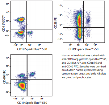 使用抗CD19-Spark Blue?550與CD4-BV570?、CD38-PE以及CD40-FITC等不同組合抗體對人全血進行染色。圖中數(shù)據(jù)均來至于淋巴細胞門。結(jié)果可以看出SparkBlue?550可以完全與FITC和PE熒光區(qū)別開,該數(shù)據(jù)使用Cytek?Aurora流式儀檢測。