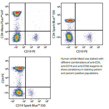 用抗CD4和抗CD19的不同熒光抗體組合對人全血染色,結(jié)果顯示Spark Blue?550染色具有有效性以及和其他常見熒光PE、AF647相比染色后相應群體比例也具有一致性。
