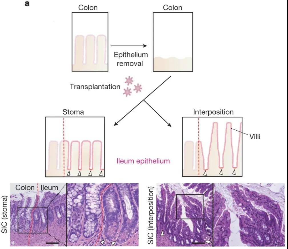 通過(guò)上皮置換產(chǎn)生SIC的策略。頂部,結(jié)腸上皮被去除(EDTA處理),然后回腸類器官被移植。在進(jìn)行介入手術(shù)之前,移植的回腸上皮顯示出隱窩狀結(jié)構(gòu)(左下圖和圖像)。移植后,會(huì)形成絨毛狀結(jié)構(gòu)(右下圖和圖像)。白色箭頭表示潘氏細(xì)胞。