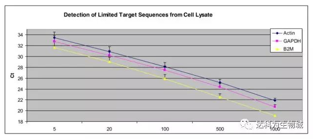 隨著HeLa細(xì)胞數(shù)的增加,分別用適量細(xì)胞裂解液裂解細(xì)胞后進(jìn)行反轉(zhuǎn)錄,而后在7700 PCR儀上進(jìn)行Actin、GAPDH和B2M基因的3復(fù)孔qPCR反應(yīng)。