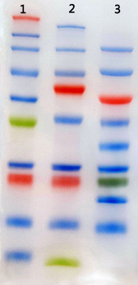 預(yù)染蛋白Marker是將幾種純化好的蛋白,與染料共價偶聯(lián)后混合而成。預(yù)染蛋白Marker的出現(xiàn)方便我們在電泳時、電泳后以及轉(zhuǎn)膜后檢測電泳情況和估計遷移率,是做WesternBlot最常用到的蛋白Marker。