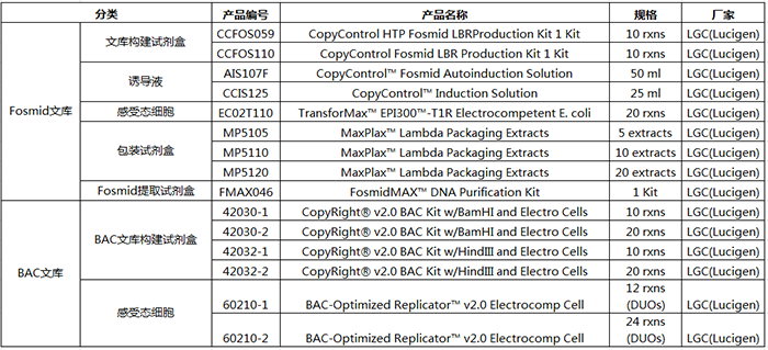 LGC(Lucigen)提供Fosmid文庫構建試劑盒,該試劑盒中的Fosmid載體是行業(yè)金標準(原屬于Epicentre產品),可完成各種生物樣本編制完整和無偏向的Fosmid文庫,利用自動誘導液保證單拷貝和誘導高拷貝數(shù)量的需要。
