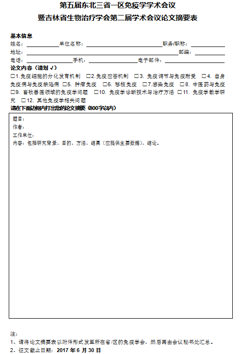 請于2017年6月30日前將“論文摘要表”發(fā)送至所在省/區(qū)的免疫學(xué)會(huì),然后再由會(huì)議秘書處匯總。